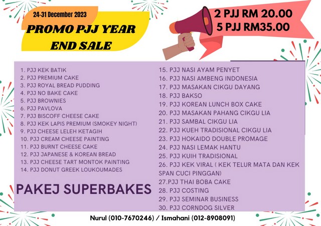 25 Disember 2023 | Aktiviti TerkiniPada 24 Disember 2023 yang lalu, pihak PEDi Sg. Bandung telah mengadakan Promosi Resepi PJJ sempena hujung tahun. Promosi ini dilakukan bagi menarik minat usahawan untuk menambah pendapatan mereka dengan resepi-resepi yang ditawarkan dengan harga yang berpatutan. Seorang peserta telah menyertai Promosi Resepi PJJ sempena hujung tahun.