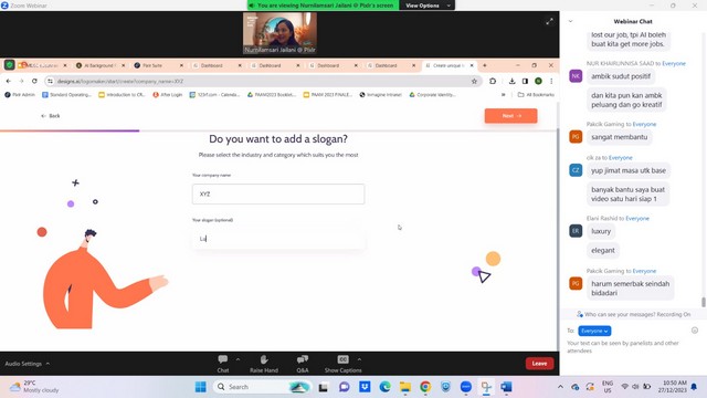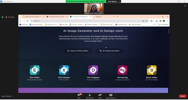 28 Disember 2023 | Aktiviti TerkiniPada 27 Disember 2023 yang lalu, staf PEDi Sg. Bandung telah menyertai webinar strategi Cipta Bahan Promosi dengan AI: Bijak, Cepat dan Mudah secara atas talian menggunakan aplikasi Zoom Meeting. Webinar ini merupakan anjuran daripada Pihak MDEC Eusahawan hasil kolaborasi dengan PIXLR. Dalam sesi webinar ini berkongsi bagaimana AI menjadikan Promosi secara Bijak, Cepat dan Mudah.