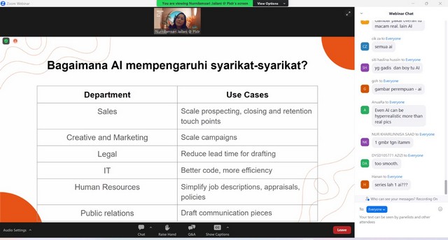 Secara umumnya, AI mampu menyesuaikan permintaan orang dengan grafik terkini serta menjimatkan masa dan tenaga untuk mengautomasikan proses. AI juga digunakan untuk penyelidikan pasaran yang hampir berkesan. Selain itu, dalam webinar ini berkongsi berkenaan dengan aplikasi-aplikasi yang menggunakan AI yang boleh digunakan untuk usahawan.