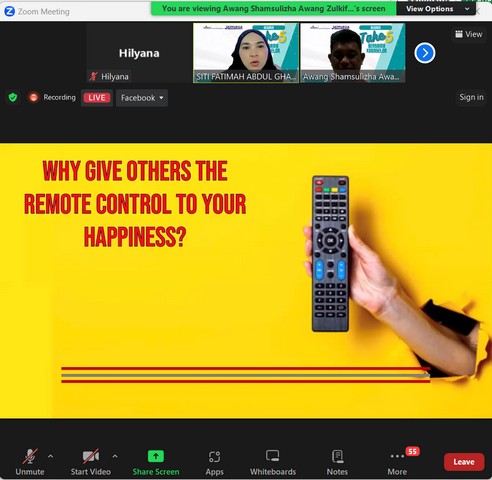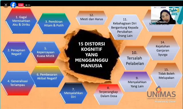 18 Oktober 2023 | Aktiviti TerkiniPada 17 Oktober yang lalu, staf PEDi Sungai Bandung telah Pada 16 Oktober 2023 (Isnin), staf Pedi Sg. Bandung telah menyertai Webinar Sharing yang bertajuk “Cognitive Behavioral Therapy For Stress Relief”. Webinar ini dianjurkan oleh UNIMAS. Webinar ini diadakan secara dalam talian melalui aplikasi Zoom. Webinar ini bertujuan untuk berkongsi berkenaan Terapi tingkah laku kognitif. Terapi tingkah laku kognitif ataupun Cognitive Behavioral Therapy (CBT) ialah satu bentuk rawatan psikologi yang memfokuskan pada menghubungkan pemikiran, kepercayaan dan sikap dengan tingkah laku seseorang. Sebagai contoh, pemikiran negatif menyebabkan seseorang mempunyai perasaan dan tingkah laku yang merosakkan diri sendiri.