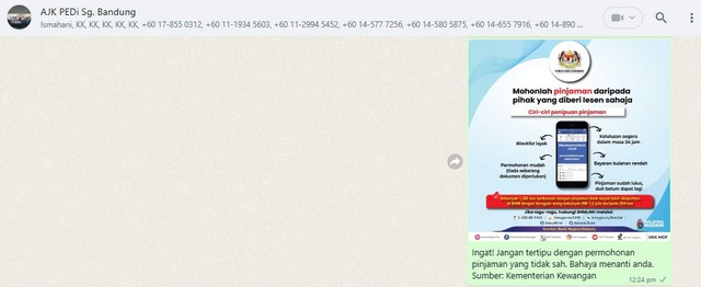 26 Mac 2024 | Aktiviti TerkiniPada 25 Mac 2024 (Isnin), petugas NADI Sg. Bandung telah berkongsi mengenai “Klik Dengan Bijak: Penipuan Pinjaman” kepada AJK NADI Sungai Bandung. Orang ramai diminta untuk berhati-hati dan sentiasa berwaspada dengan permohonan pinjaman yang tidak sah. Elakkan diri dari terpedaya dengan Penipuan Pinjaman.