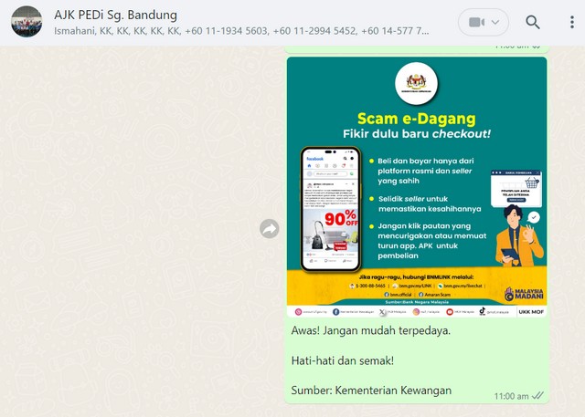 27 Februari 2024 | Aktiviti TerkiniPada 26 Februari 2024 (Isnin), petugas PEDi Sg. Bandung telah berkongsi mengenai “Klik Dengan Bijak: Scam e-Dagang” kepada AJK PEDi Sungai Bandung. Petugas PEDi berkongsi mengenai topik Scam e-Dagang. Orang ramai diminta untuk berhati-hati semasa membuat pembelian secara atas talian.