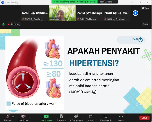30 Oktober 2024 | Aktiviti TerkiniPada 29 Oktober 2024, petugas NADI telah menyertai webinar dalam talian menggunakan Zoom Meeting. Dalam webinar ini menerangkan berkaitan dengan penyakit darah tinggi dan bagaimana mengawal hipertensi. Dalam webinar itu juga menerangkan punca hipertensi dan symptom-simptom seseorang mengalami penyakit hipertensi. Webinar ini diadakan untuk memberi kesedaran kepada masyarakat tentang bahaya darah tinggi jika tidak mendapatkan rawatan.