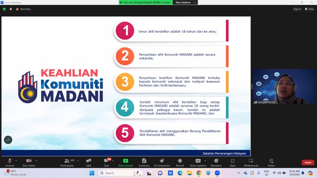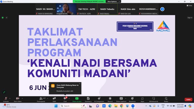 7 Jun 2024 | Aktiviti TerkiniPada 6 Jun 2024 (Khamis), petugas NADI telah menghadiri taklimat secara online melalui Zoom Meeting. Taklimat ini diadakan bagi memberikan penerangan dan bagaimana cara pelaksanaan “Kenali NADI Bersama Komuniti MADANI”.