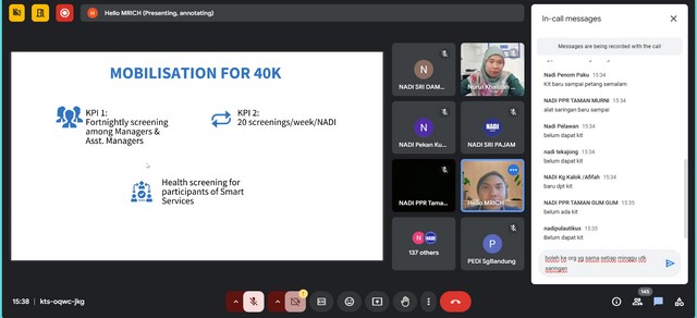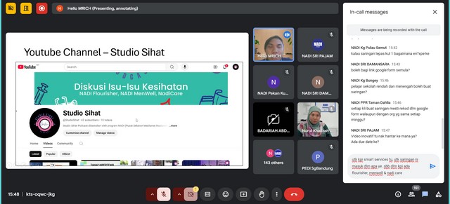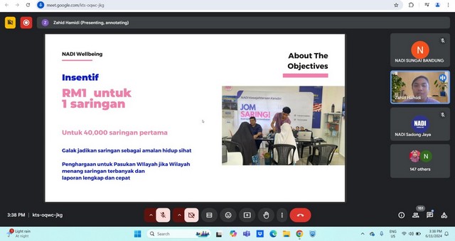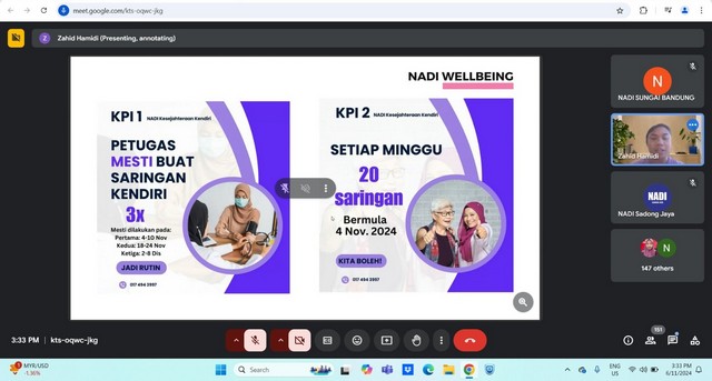 7 November 2024 | Aktiviti TerkiniPada 06 November 2024 (Rabu), petugas NADI telah menyertai webinar Wellbeing Support melalui Google Meet. Webinar ini dijalankan untuk petugas-petugas NADI berbincang dan mendapatkan maklumat terkini mengenai saringan kesihatan yang dijalankan di NADI. Sebagai usaha untuk menggalakkan rakyat Malaysia mengamalkan gaya hidup sihat dan lebih cakna dengan kesihatan diri sendiri, perkhidmatan pintar NADI Kesejahteraan Kendiri menggalakkan orang ramai untuk datang ke NADI yang berdekatan untuk saringan kesihatan seperti bacaan tekanan darah, BMI dan juga kandungan gula di dalam badan. Objektif utama adalah untuk mengalakkan komuniti untuk lebih peduli menjaga kesihatan masing-masing dengan mengambil langkah proaktif mengetahui tahap kesihatan masing-masing.