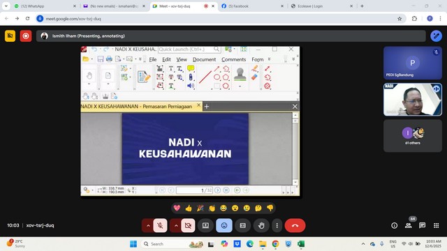 13 Jun 2025 | Aktiviti TerkiniSeorang peserta NADI X Keusahawanan Cohort 3 NADI Sungai Bandung telah menyertai webinar Pemasaran dan Operasi Perniagaan pada 12 Jun 2025 (Khamis) yang lepas. Tujuan webinar ini adalah untuk membantu usahawan memahami strategi pemasaran yang efektif serta bagaimana mengurus operasi harian perniagaan secara sistematik dan efisien.
