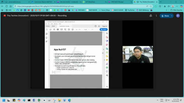 13 Oktober 2025 | Aktiviti TerkiniPada 12 Oktober 2025, seorang pelajar sekolah menengah telah menyertai Bengkel Tiny Techies: IoT Inovasi Sesi 2 yang secara atas talian melalui platform Google Meet di NADI Sungai Bandung. Bengkel ini merupakan sambungan daripada sesi pertama dan memberi tumpuan kepada pembelajaran dalam bidang Internet of Things (IoT).