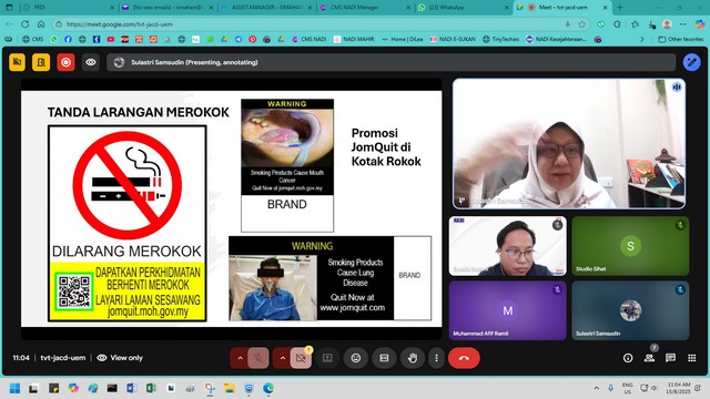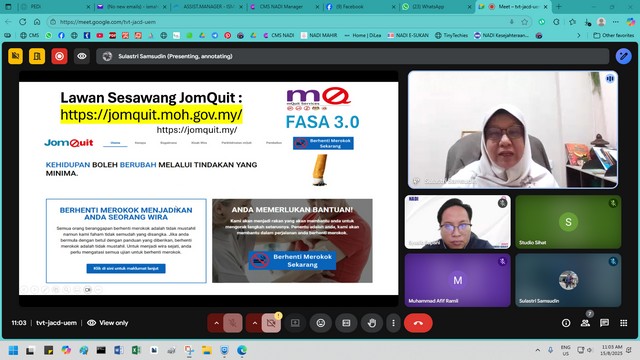 16 Ogos 2025 | Aktiviti TerkiniPada 15 Ogos 2025 (Jumaat), seorang peserta dari NADI Sungai Bandung telah menyertai Webinar Kesejahteraan Kendiri yang bertajuk “Quit Smoking Tanya Farmasi! - Ceramah Dah Banyak, Sekarang Nak Cara Real”. Webinar ini telah dianjurkan bagi membantu perokok mencari pendekatan lebih praktikal untuk berhenti merokok.