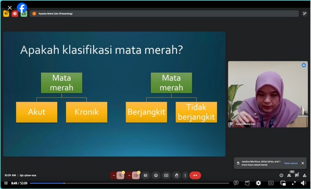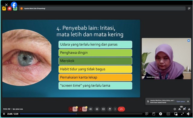 1 Mac 2025 | Aktiviti TerkiniPada 28 Februari 2025, petugas NADI Sungai Bandung telah menyertai Webinar Kesejahteraan Kendiri yang bertajuk Mata Merah "Jangkitan Biasa atau Petanda Masalah Serius. Dr. Ayesha Mohd Zain, Pakar Oftalmologi PPUKM akan membincangkan mengenai: