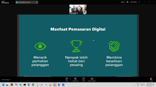 Pada 28 Mei 2025 (Isnin) telah berlangsungnya webinar eKelas Usahawan yang bertajuk “Strategi Pemasaran Digital” secara dalam talian menggunakan platform Zoom. Dalam modul ini, peserta akan didedahkan kepada asas dan teknik penting dalam merancang strategi pemasaran digital yang berkesan untuk perniagaan kecil dan sederhana. Antara topik yang diketengahkan termasuklah mengenal pasti sasaran pelanggan, membina kehadiran dalam talian, serta penggunaan platform digital seperti media sosial, laman web dan e-mel untuk meningkatkan capaian pasaran. Strategi pemasaran digital yang betul bukan sahaja dapat memperluas jangkauan perniagaan, malah mampu mengubah hala tuju serta prestasi perniagaan secara keseluruhan.