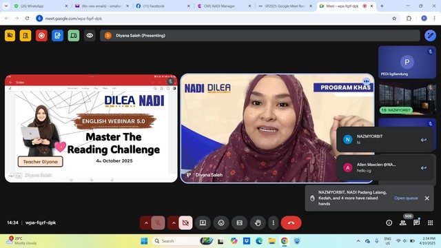 5 Oktober 2025 | Aktiviti TerkiniPada 04 Oktober 2025, seorang pelajar sekolah menengah telah menyertai Webinar Berkala Bahasa Inggeris Edisi Ke-5 di NADI Sungai Bandung. Webinar ini merupakan program khas di bawah inisiatif DILEA: Tuisyen Rakyat yang bertujuan membantu pelajar meningkatkan penguasaan bahasa Inggeris dengan cara yang interaktif dan menyeronokkan.