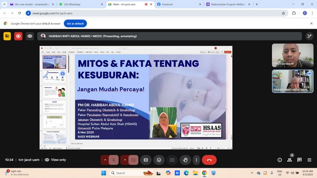 7 Mei 2025 | Aktiviti TerkiniPada 06 Mei 2025 (Selasa), satu inisiatif NADI Kesejahteraan Kendiri iaitu webinar FlourisHER diadakan bertujuan untuk meningkatkan kesedaran tentang kesuburan wanita serta membetulkan persepsi umum yang sering terpengaruh dengan mitos-mitos yang tidak berasaskan fakta. Petugas NADI Sungai Bandung telah menyertai webinar dalam talian iaitu mengenai Mitos & fakta tentang kesuburan. Bersama penceramah jemputan iaitu Prof Madya Dr Habibah Abdul Hamid merupakan Pakar Perunding O&G dan juga Pakar Kesuburan dari Fakulti Perubatan dan Sains Kesihatan UPM.