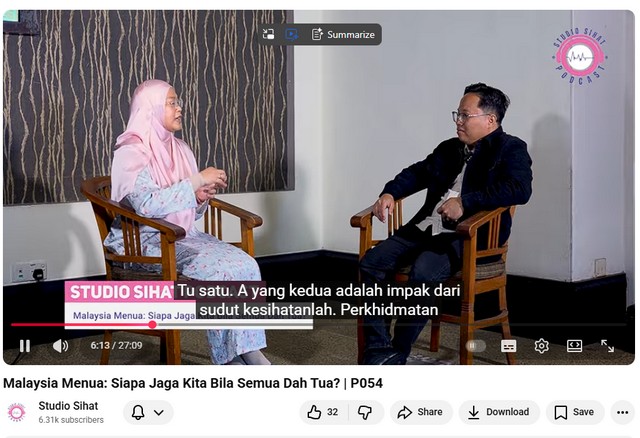 5 Disember 2025 | Aktiviti TerkiniPada 04 Disember 2025, seorang peserta telah menonton podcast Studio Sihat di YouTube bertajuk “Malaysia Menua: Siapa Jaga Kita Bila Semua Dah Tua”. Podcast ini membincangkan isu penuaan masyarakat di Malaysia yang semakin ketara, serta cabaran yang bakal dihadapi apabila jumlah warga emas meningkat dan keperluan penjagaan jangka panjang terus bertambah. Peserta didedahkan kepada realiti sistem sokongan semasa, beban keluarga dalam menjaga warga emas, serta kepentingan penyediaan fasiliti penjagaan yang lebih mampan.