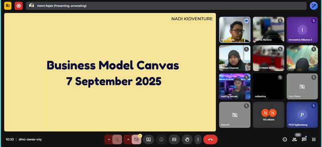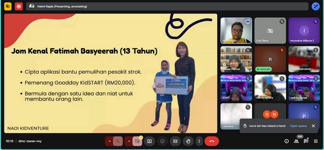 7 Disember 2025 | Aktiviti TerkiniPada 06 Disember 2025, dua orang peserta dari NADI Sungai Bandung telah menyertai Webinar KidVenture Cohort 8 yang dijalankan secara dalam talian melalui platform Google Meet. Sesi ini berfokus kepada topik Pelan Perniagaan Pintar Saya, bertujuan memberi pendedahan kepada peserta tentang asas keusahawanan dan kemahiran merancang perniagaan secara kreatif dan strategik.