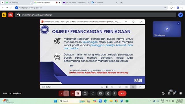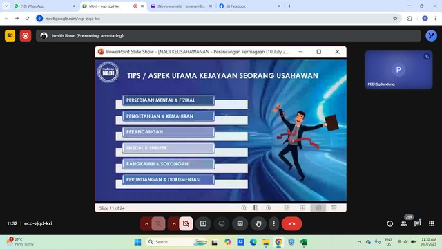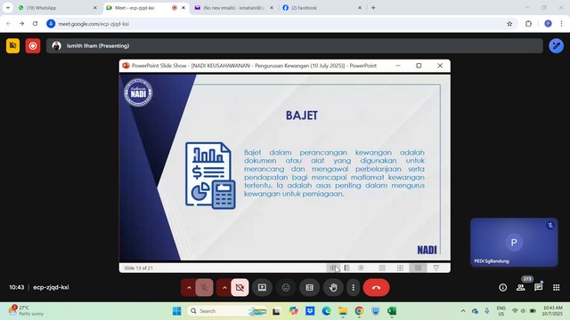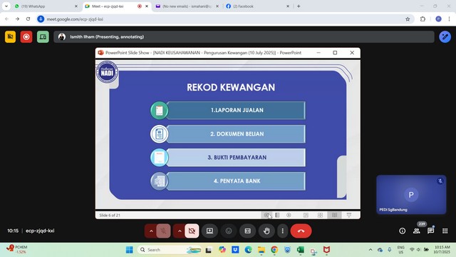 11 Julai 2025 | Aktiviti TerkiniPada 10 Julai 2025, dua orang usahawan NADI Sungai Bandung telah menyertai Webinar Keusahawanan yang bertajuk Pengurusan Kewangan dan Perancangan Perniagaan. Webinar ini bertujuan untuk memberikan pendedahan serta panduan praktikal kepada usahawan, pemilik perniagaan kecil dan sederhana (PKS), serta individu yang berminat untuk memulakan perniagaan mengenai aspek penting dalam pengurusan kewangan dan perancangan perniagaan yang berkesan.