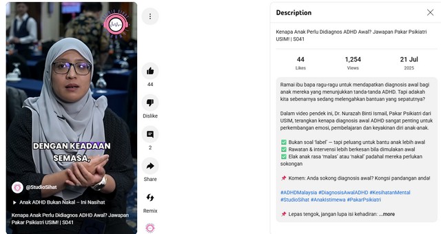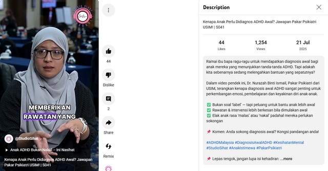 25 Julai 2025 | Aktiviti TerkiniPada 24 Julai 2025, seorang peserta dari NADI Sungai Bandung telah menyertai Podcast Kesejahteraan Kendiri yang bertajuk “ADHD Kenapa Penting Dapatkan Diagnosis Awal”. Podcast ini memberi pencerahan kepada ibu bapa untuk diagnosis awal anak. Ramai ibu bapa ragu-ragu untuk mendapatkan diagnosis awal bagi anak mereka yang menunjukkan tanda-tanda ADHD. Dalam video pendek ini, Dr. Nurazah Binti Ismail, Pakar Psikiatri dari USIM, terangkan kenapa diagnosis awal ADHD sangat penting untuk perkembangan emosi, pembelajaran dan keyakinan diri anak-anak.