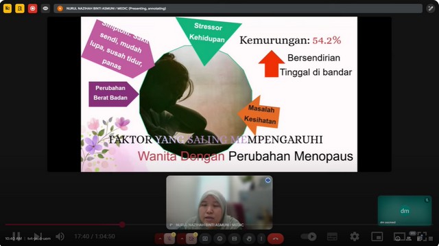 Menopaus sering dianggap sebagai satu penamat kepada fasa kesuburan, namun sebenarnya ia adalah permulaan kepada satu episod kehidupan baru yang boleh dilalui dengan lebih sihat dan bermakna. Dalam webinar ini, para peserta didedahkan kepada maklumat mengenai simptom menopaus, kesan fizikal dan emosi, serta langkah-langkah penjagaan diri dari aspek pemakanan, senaman dan sokongan emosi.