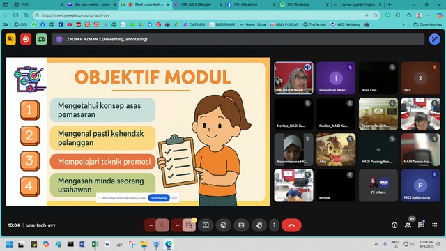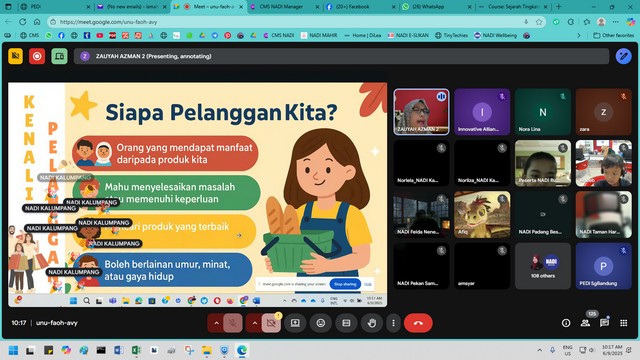7 September 2025 | Aktiviti TerkiniPada 06 September 2025 (Sabtu), NADI Sungai Bandung telah menyertai Webinar Kidventure Cohort 5 bertajuk Pemasaran Dengan Elemen AI yang memberi tumpuan kepada penguasaan ChatGPT dan Canva AI dalam strategi pemasaran digital. Peserta mempelajari cara menggunakan ChatGPT untuk menjana idea kreatif, menulis salinan promosi yang menarik serta merancang strategi kandungan, manakala Canva AI dimanfaatkan untuk menghasilkan grafik, poster dan video dengan cepat dan profesional. Selain itu, peserta turut didedahkan dengan teknik merekabentuk poster produk menggunakan aplikasi digital secara praktikal, sekali gus menunjukkan bagaimana AI dapat memudahkan urusan pemasaran, menjimatkan masa dan meningkatkan kualiti hasil kerja.