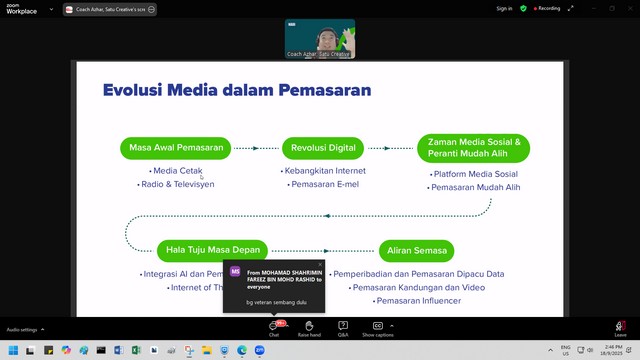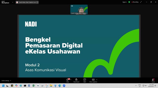 19 September 2025 | Aktiviti TerkiniPada 18 September 2025, telah berlangsung Program eKelas Usahawan Modul 2: Asas Komunikasi Visual yang disertai oleh dua orang peserta dari NADI Sungai Bandung. Sesi ini memberi fokus kepada kepentingan komunikasi visual dalam dunia perniagaan, khususnya bagaimana elemen visual mampu mempengaruhi persepsi pelanggan dan menarik minat terhadap sesuatu produk atau perkhidmatan.