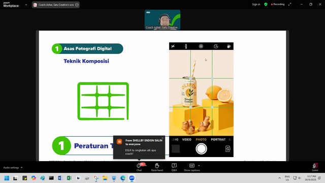 Sesi pembelajaran dijalankan secara interaktif, di mana peserta berpeluang mencuba sendiri menghasilkan idea visual ringkas menggunakan perisian percuma dalam talian. Pendekatan ini membantu peserta memahami bagaimana komunikasi visual yang baik boleh meningkatkan daya tarikan sesuatu produk, membina identiti jenama, serta meningkatkan kepercayaan pelanggan.
