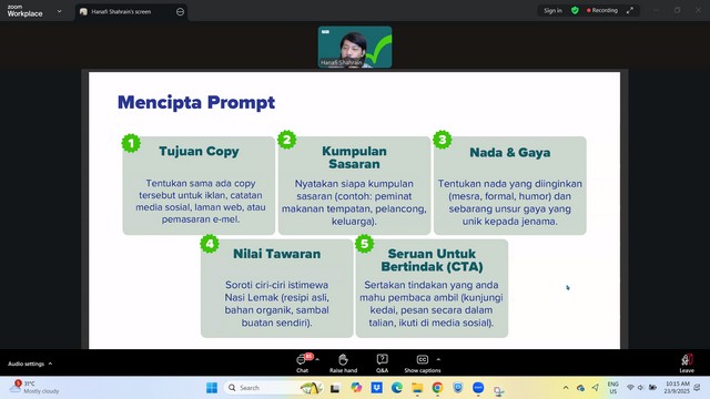 24 September 2025 | Aktiviti TerkiniPada 23 September 2025, telah berlangsung eKelas Usahawan Modul 3: AI untuk Mencipta Kandungan di NADI Sungai Bandung dengan penyertaan dua orang peserta. Modul ini bertujuan memperkenalkan usahawan kepada penggunaan teknologi Kecerdasan Buatan (AI) dalam penghasilan kandungan digital yang kreatif, menarik dan berkesan.