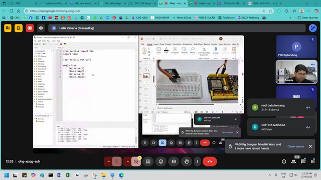 Sepanjang bengkel, peserta dibimbing langkah demi langkah bermula daripada proses memuat turun Thonny IDE, memahami antaramuka asasnya, hinggalah kepada menulis kod ringkas menggunakan MicroPython. Peserta turut mencuba fungsi asas kit inovasi, antaranya mengawal LED serta berinteraksi dengan sensor melalui arahan pengaturcaraan mudah.