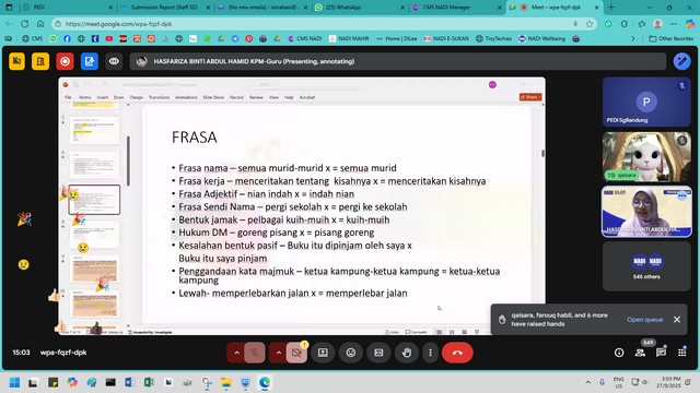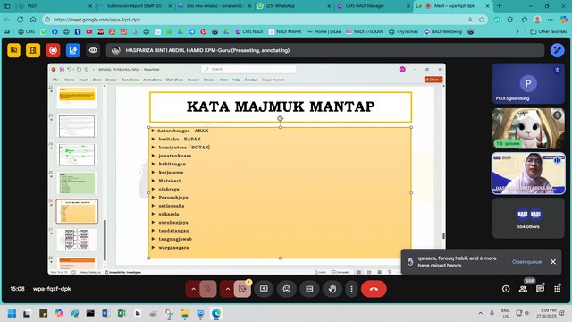 28 September 2025 | Aktiviti TerkiniPada 27 September 2025, dua orang pelajar sekolah menengah telah menyertai Webinar Berkala Bahasa Melayu – Edisi 4 di NADI Sungai Bandung. Webinar ini dijalankan secara dalam talian dan disampaikan dalam suasana santai tetapi padat dengan penerangan, tips dan trik tatabahasa bagi membantu pelajar lebih mudah memahami aturan bahasa yang betul.