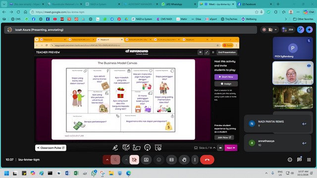 Sepanjang sesi webinar, peserta diperkenalkan kepada konsep Business Model Canvas sebagai alat perancangan perniagaan yang membantu menyusun idea perniagaan secara ringkas dan sistematik. Penceramah menerangkan elemen utama dalam BMC seperti segmen pelanggan, cadangan nilai, saluran pemasaran, aliran pendapatan dan struktur kos.