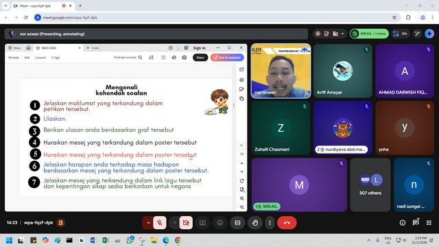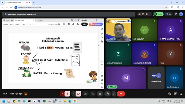 21 Februari 2026 | Aktiviti TerkiniPada 21 Februari 2026, dua orang peserta telah menyertai Webinar Kidsventure Pemasaran 1 di NADI Sungai Bandung melalui platform Google Meet. Peserta diberikan pendedahan mengenai konsep asas pemasaran, termasuk cara memperkenalkan produk atau perkhidmatan kepada orang ramai secara kreatif dan berkesan. Webinar ini juga menjelaskan bagaimana pemasaran dapat menarik minat pelanggan serta meningkatkan jualan. Tenaga pengajar, Puan Zafirah Amalina Zainol Anuar, turut berkongsi contoh praktikal melalui bisnes aiskrim untuk membantu peserta memahami penerapan konsep pemasaran dalam dunia sebenar.