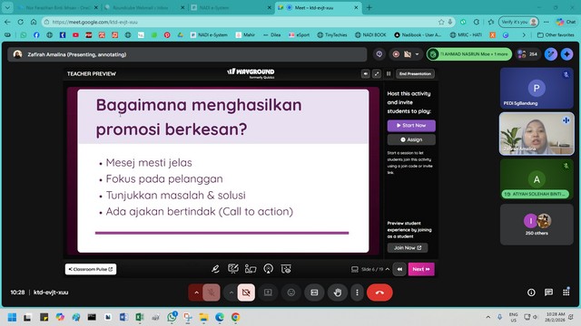 28 Februari 2026 | Aktiviti TerkiniPada 28 Februari 2026, dua orang peserta telah menyertai Webinar Kidsventure Pemasaran 2 yang dijalankan secara dalam talian melalui platform Google Meet. Webinar ini bertujuan memberi pendedahan mengenai maksud promosi, kepentingannya dalam meningkatkan kesedaran jenama, menarik pelanggan serta membantu meningkatkan jualan sesuatu produk atau perkhidmatan.