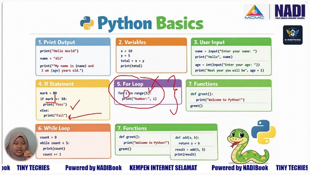 Peserta juga mempelajari asas Python seperti jenis data, penggunaan pembolehubah, struktur kawalan seperti if-else, gelung (loop), serta fungsi asas. Aktiviti latihan turut dijalankan bagi membantu peserta memahami konsep dengan lebih jelas.