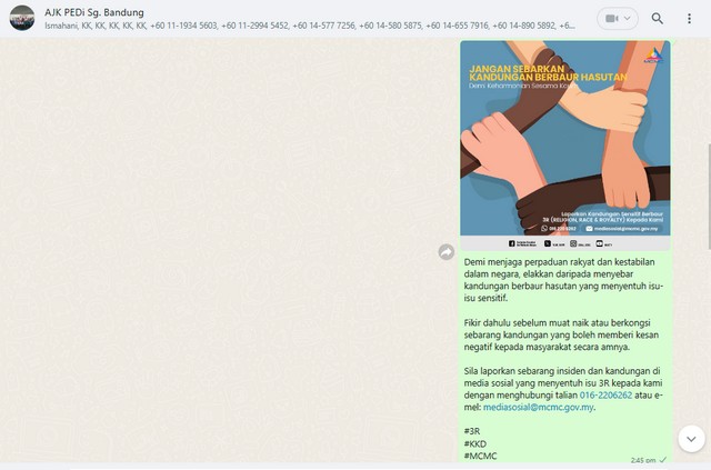 Sila laporkan sebarang insiden dan kandungan di media sosial yang menyentuh isu 3R kepada MCMC dengan menghubungi talian 016-2206262 atau emel kepada mediasosial@mcmc.gov.my.