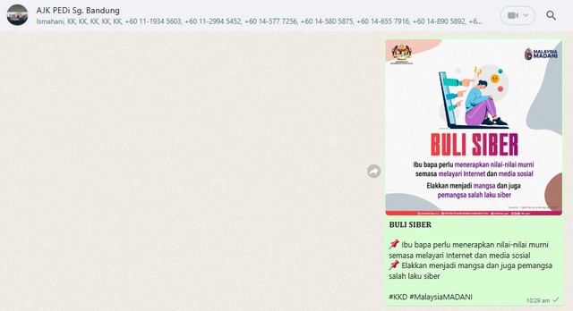 6 Disember 2023 | Aktiviti TerkiniPada 05 Disember 2023 yang lalu, pihak PEDi Sg. Bandung telah berkongsi mengenai “Klik Dengan Bijak : Buli Siber”. Buli siber atau gangguan siber adalah sejenis buli yang berlaku dalam talian.