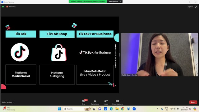 18 Julai 2024 | Aktiviti TerkiniPada 17 Julai 2024 (Selasa), petugas NADI Sg. Bandung telah menghadiri webinar secara online melalui Zoom Meeting. Webinar ini merupakan perkongsian mengenai bisnes shoppertainment yang semakin popular melalui platform Tiktok Shop.