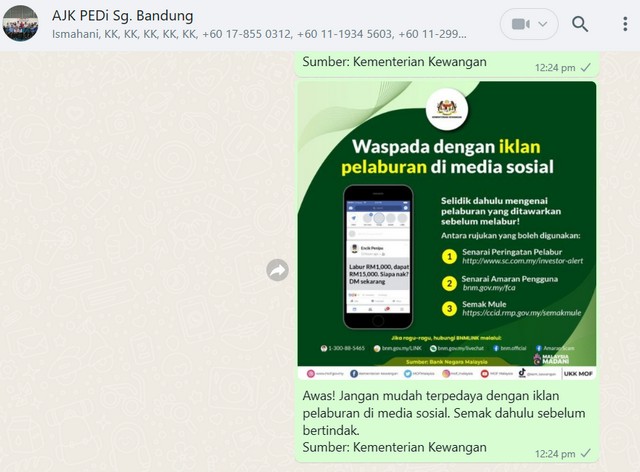 26 Mac 2024 | Aktiviti TerkiniPada 25 Mac 2024 yang lalu, pihak NADI Sg. Bandung telah berkongsi mengenai Klik Dengan Bijak, “Waspada Dengan Iklan Pelaburan di Media Sosial”. Orang ramai dinasihatkan agar sentiasa berhati-hati dengan iklan pelaburan di media sosial mahupun di tempat lain kerana ia mungkin tipu helah "scammer" yang boleh menyebabkan kecurian maklumat peribadi dan kehilangan wang.