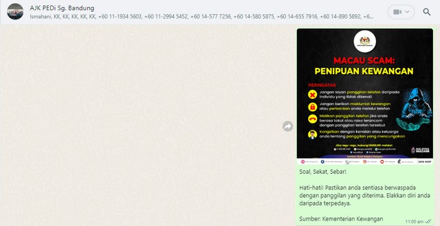 27 Februari 2024 | Aktiviti TerkiniPada 26 Februari 2024 (Isnin), petugas PEDi Sg. Bandung telah berkongsi mengenai “Klik Dengan Bijak: Macau Scam” kepada AJK PEDi Sungai Bandung. Petugas PEDi berkongsi mengenai topik Macau Scam. Orang ramai diminta untuk berhati-hati dan sentiasa berwaspada dengan panggilan telefon yang diterima. Elakkan diri dari terpedaya dengan Macau Scam.