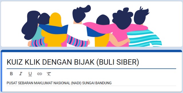 29 Disember 2024 | Aktiviti TerkiniPada 28 Disember 2024 (Sabtu), NADI Sg. Bandung telah mengadakan Kuiz Buli Siber. Kuiz tersebut dilakukan secara atas talian melalui Google Form. Kuiz Buli Siber ini bertujuan untuk menguji pengetahuan komuniti mengenai Buli Siber.