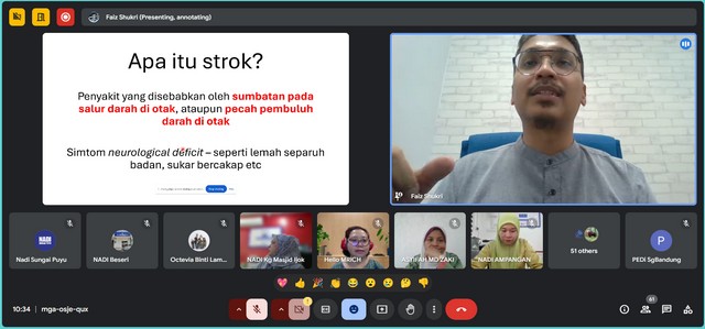 27 November 2024 | Aktiviti TerkiniPada 26 November 2024 (Selasa), petugas NADI telah menyertai sesi webinar dalam talian menggunakan Google Meet. Dalam webinar ini menerangkan berkaitan ancaman strok. Strok merupakan penyakit yang disebabkan oleh sumbatan pada salur darah di otak ataupun dikenali sebagai pecah pembuluh darah di otak. Dalam webinar ini juga menerangkan berkaitan dengan tiga jenis strok iaitu strok iskemik, strok berdarah dan strok kecil iaitu strok minor sahaja. Faktor seseorang itu boleh terkena serangan strok ialah seseorang yang menghadapi penyakit seperti kencing manis, darah tinggi, kolestrol, obesiti, gaya hidup tidak sihat, merokok dan sakit jantung. Untuk mencegah strok hendaklah mengamalkan gaya hidup sihat dan memastikan keadaan kesihatan kita dalam keadaan baik.