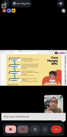 12 Oktober 2025 | Aktiviti TerkiniPada 11 Oktober 2025, dua orang peserta dari NADI Sungai Bandung telah menyertai Webinar KidVenture Cohort 6 yang dijalankan secara dalam talian melalui platform Google Meet. Sesi ini berfokus kepada topik Pelan Perniagaan Pintar Saya, bertujuan memberi pendedahan kepada pelajar tentang asas keusahawanan dan kemahiran merancang perniagaan secara kreatif dan strategik.