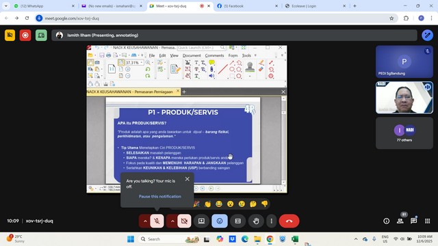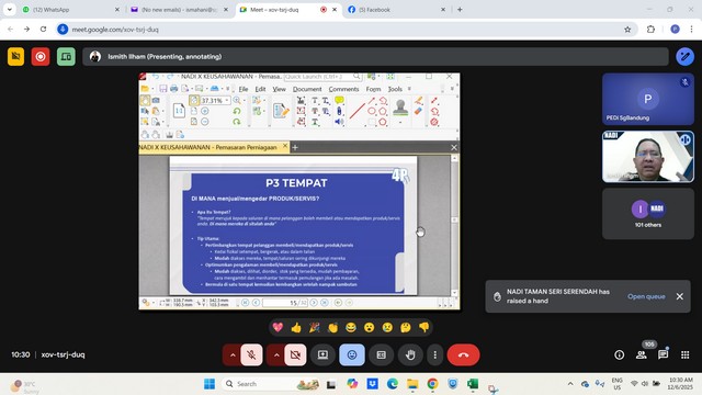 13 Jun 2025 | Aktiviti TerkiniSeorang peserta NADI X Keusahawanan Cohort 3 NADI Sungai Bandung telah menyertai webinar Pemasaran dan Operasi Perniagaan pada 12 Jun 2025 (Khamis) yang lepas. Tujuan webinar ini adalah untuk membantu usahawan memahami strategi pemasaran yang efektif serta bagaimana mengurus operasi harian perniagaan secara sistematik dan efisien.