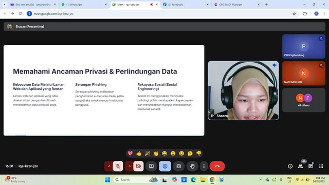 15 Mei 2025 | Aktiviti TerkiniPada 14 Mei 2025 (Rabu), NADI X Kesedaran telah mengadakan taklimat Shield yang bertajuk Lindungi Data Peribadi untuk peserta 13 tahun ke atas. Taklimat ini bertujuan untuk meningkatkan kesedaran peserta tentang pentingnya melindungi data peribadi anda. Jangan biarkan data anda jatuh ke tangan orang yang salah. Para peserta diberi penerangan berkaitan ancaman privasi dan perlindungan data. Selain itu, penerangan berkaitan cara melindungi data peribadi seperti melalui kata laluan yang kukuh, sentiasa kemaskini peranti dan jangan klik pautan yang mencurigakan.