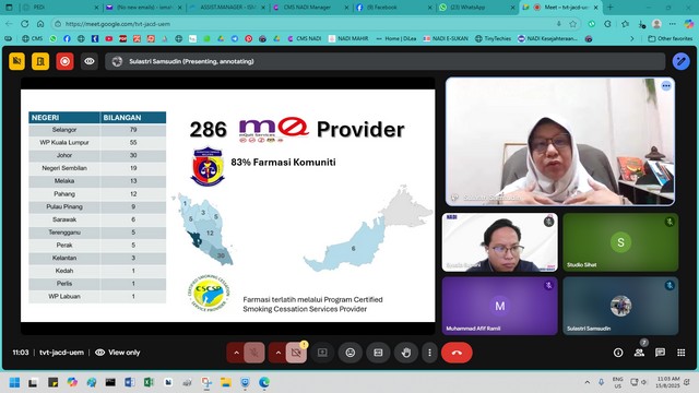 16 Ogos 2025 | Aktiviti TerkiniPada 15 Ogos 2025 (Jumaat), seorang peserta dari NADI Sungai Bandung telah menyertai Webinar Kesejahteraan Kendiri yang bertajuk “Quit Smoking Tanya Farmasi! - Ceramah Dah Banyak, Sekarang Nak Cara Real”. Webinar ini telah dianjurkan bagi membantu perokok mencari pendekatan lebih praktikal untuk berhenti merokok.