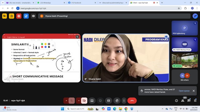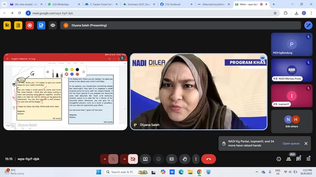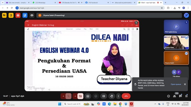 Pada 16 Ogos 2025 (Sabtu), seorang pelajar dari NADI Sungai Bandung telah menyertai satu Webinar Berkala Bahasa Inggeris Edisi ke-4 dengan topik “Pengukuhan Format & Persediaan UASA”. Webinar ini telah dianjurkan khusus bagi membantu pelajar Tingkatan 1 hingga Tingkatan 5 membuat persediaan menghadapi penilaian Ujian Akhir Sesi Akademik (UASA).