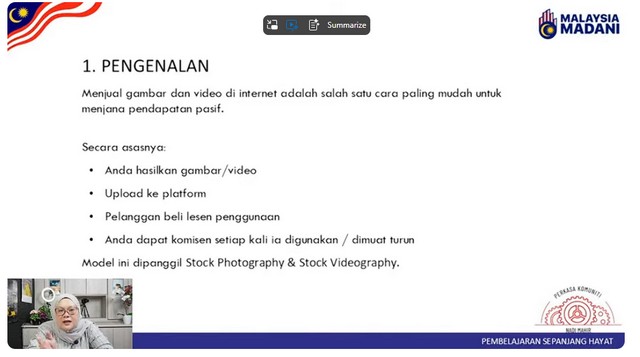 21 November 2025 | Aktiviti TerkiniPada 20 November 2025, seramai dua peserta telah menonton sesi Mahir Short Learning bertajuk Kamera Jadi Duit secara langsung di YouTube. Sesi ini memberi pendedahan kepada peserta tentang cara memanfaatkan kamera untuk menjana pendapatan, termasuk teknik fotografi asas, penghasilan kandungan kreatif, dan strategi pemasaran digital.