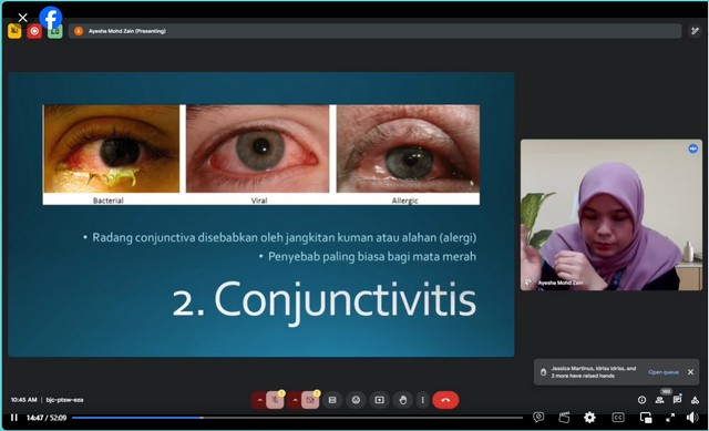 1 Mac 2025 | Aktiviti TerkiniPada 28 Februari 2025, petugas NADI Sungai Bandung telah menyertai Webinar Kesejahteraan Kendiri yang bertajuk Mata Merah "Jangkitan Biasa atau Petanda Masalah Serius. Dr. Ayesha Mohd Zain, Pakar Oftalmologi PPUKM akan membincangkan mengenai: