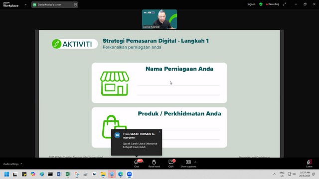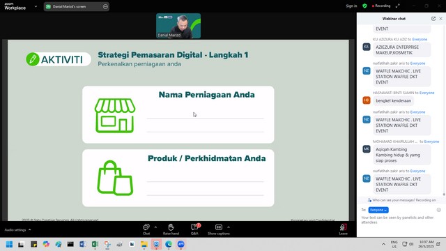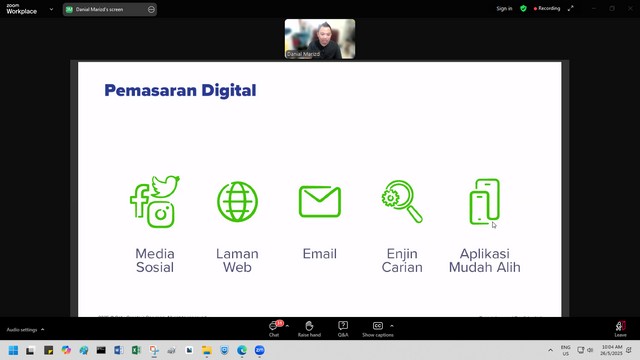 Pada 28 Mei 2025 (Isnin) telah berlangsungnya webinar eKelas Usahawan yang bertajuk “Strategi Pemasaran Digital” secara dalam talian menggunakan platform Zoom. Dalam modul ini, peserta akan didedahkan kepada asas dan teknik penting dalam merancang strategi pemasaran digital yang berkesan untuk perniagaan kecil dan sederhana. Antara topik yang diketengahkan termasuklah mengenal pasti sasaran pelanggan, membina kehadiran dalam talian, serta penggunaan platform digital seperti media sosial, laman web dan e-mel untuk meningkatkan capaian pasaran. Strategi pemasaran digital yang betul bukan sahaja dapat memperluas jangkauan perniagaan, malah mampu mengubah hala tuju serta prestasi perniagaan secara keseluruhan.