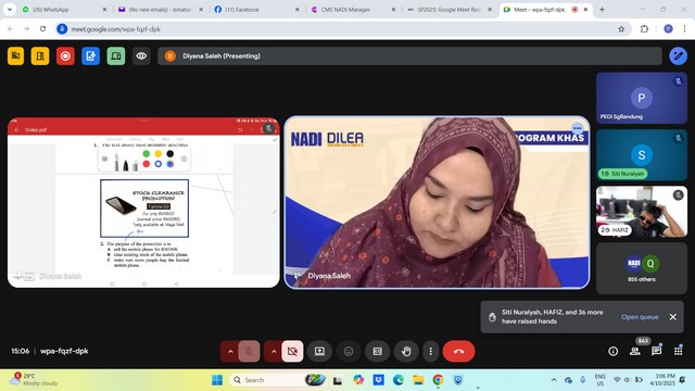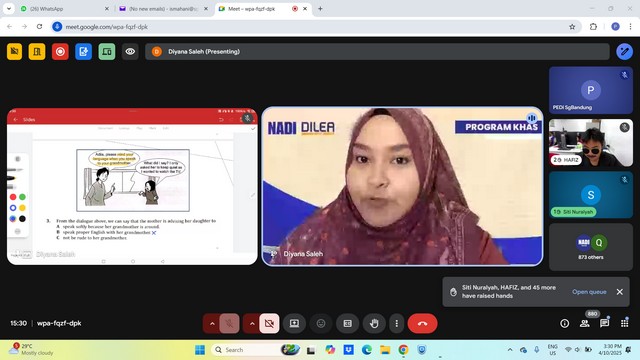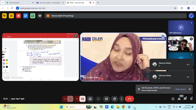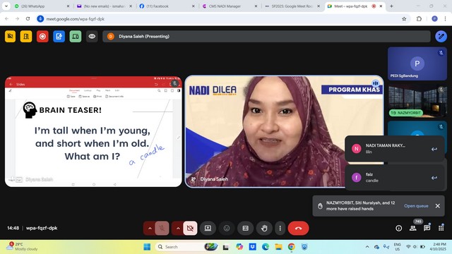 5 Oktober 2025 | Aktiviti TerkiniPada 04 Oktober 2025, seorang pelajar sekolah menengah telah menyertai Webinar Berkala Bahasa Inggeris Edisi Ke-5 di NADI Sungai Bandung. Webinar ini merupakan program khas di bawah inisiatif DILEA: Tuisyen Rakyat yang bertujuan membantu pelajar meningkatkan penguasaan bahasa Inggeris dengan cara yang interaktif dan menyeronokkan.