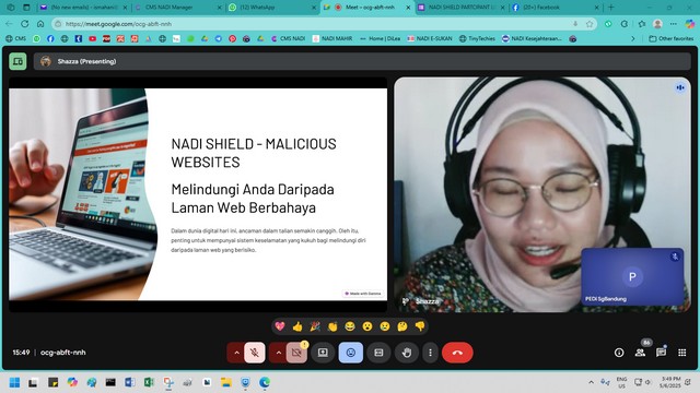 6 Jun 2025 | Aktiviti TerkiniPada 05 Jun 2025 (Khamis), NADI X Awareness iaitu NADI Shield telah mengadakan taklimat dalam talian bertajuk Laman Web Berbahaya. Taklimat ini dijalankan secara dalam talian iaitu menggunakan Google Meet. Dua orang peserta dari NADI Sungai Bandung telah mengikuti taklimat tersebut. Dalam sesi taklimat tersebut, peserta diberi pendedahan tentang cara untuk melindungi diri daripada laman web yang berbahaya dan memahami jenis-jenis laman web berbahaya.