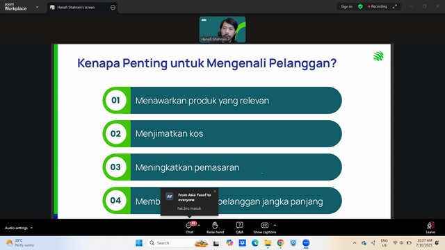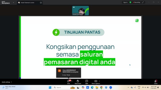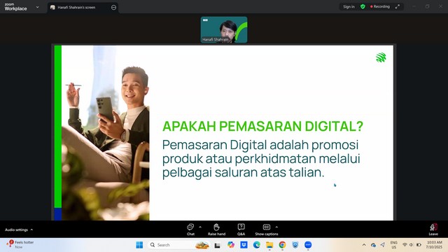 8 Oktober 2025 | Aktiviti TerkiniPada 07 Oktober 2025, NADI Sungai Bandung telah mengikuti Program eKelas Usahawan Modul 1: Strategi Pemasaran Digital yang disertai oleh seorang peserta. Program ini memberi fokus kepada kaedah dan teknik pemasaran dalam talian yang berkesan untuk membantu usahawan memperkenalkan produk atau perkhidmatan mereka kepada pasaran yang lebih luas.