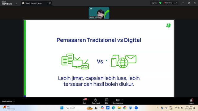 Sesi pembelajaran dilaksanakan secara interaktif, di mana peserta berpeluang bertanya soalan dan berkongsi pengalaman mereka dalam menggunakan platform digital. Penceramah juga memberikan contoh-contoh praktikal dan tip yang boleh terus diaplikasikan oleh peserta dalam usaha mereka mengembangkan perniagaan.
